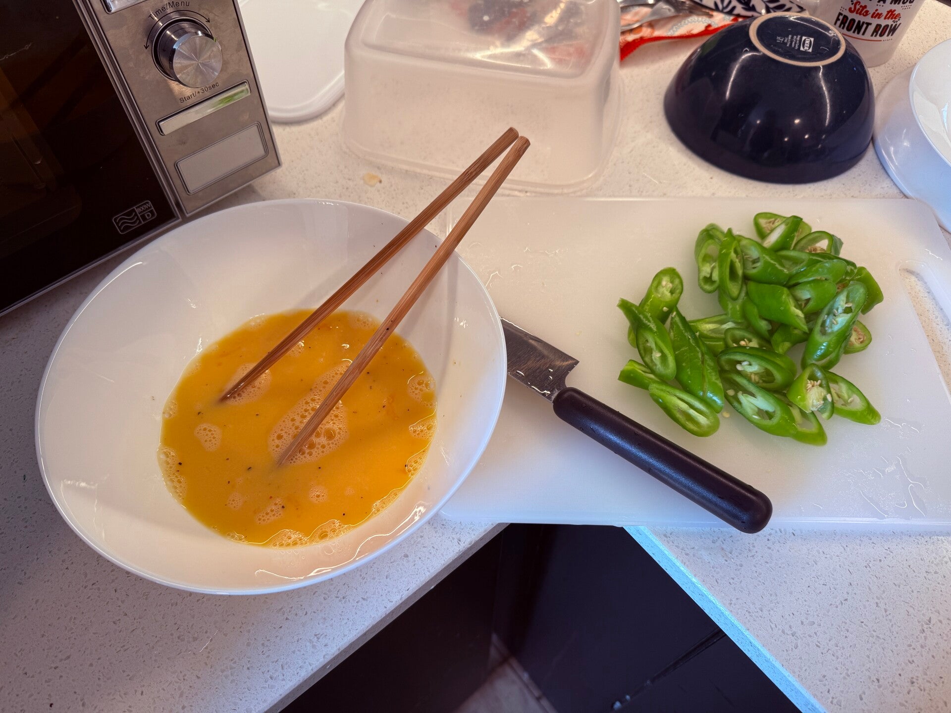 The ingredients were actually pretty simple — just flour and water for the noodles, then green peppers, eggs, eggplant, and a bit of minced meat for the sauces. It’s not a complicated dish at all, but the spices turned out to be quite a handful. Lining up all the bottles and jars made my kitchen look busier than it really was.