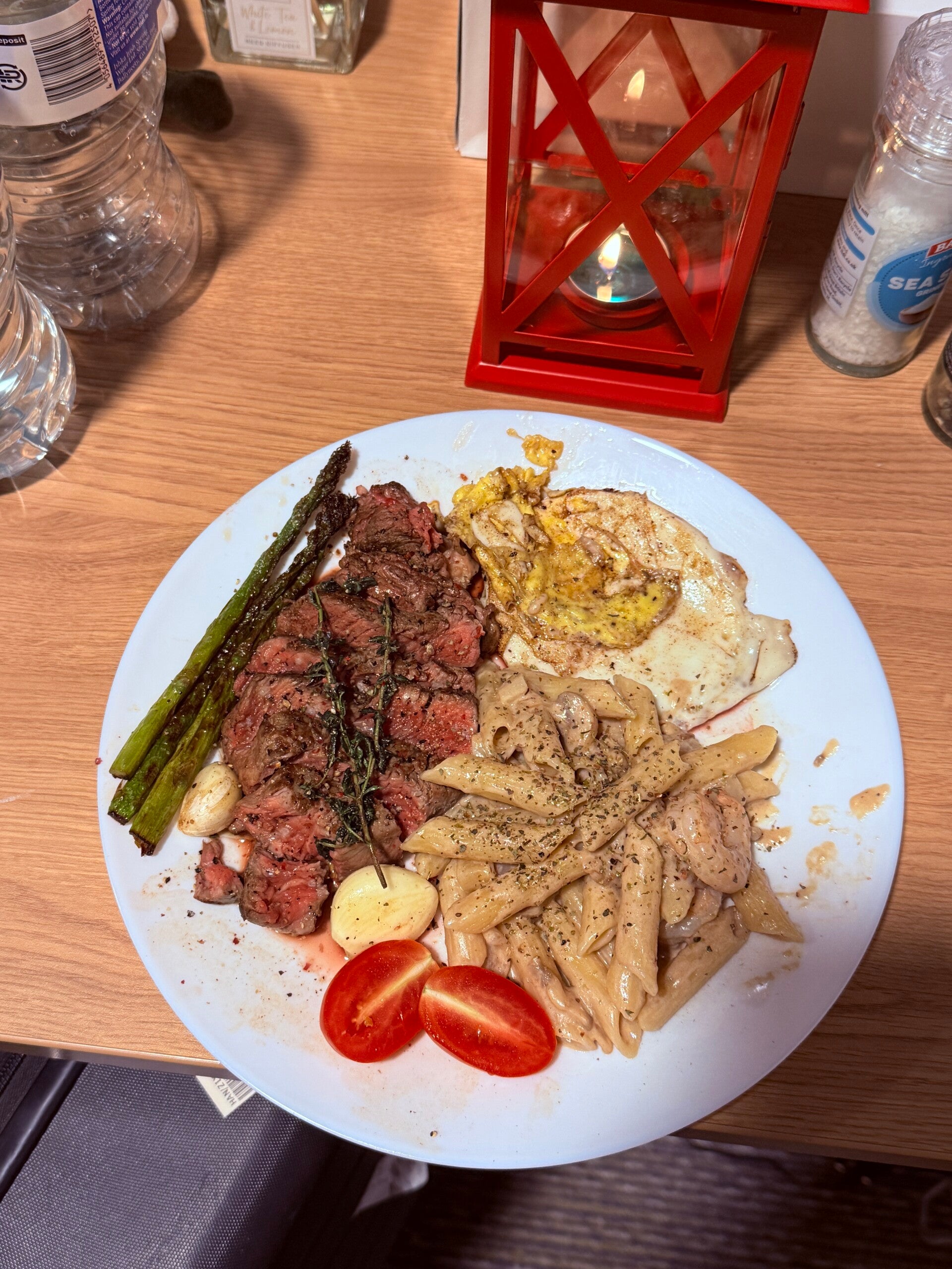 Cooking this dish took me around 30–35 minutes in total. The steak was the most time-sensitive part because I really wanted to get the perfect medium-rare. The pasta and egg were much easier, so I cooked them while the steak was resting.